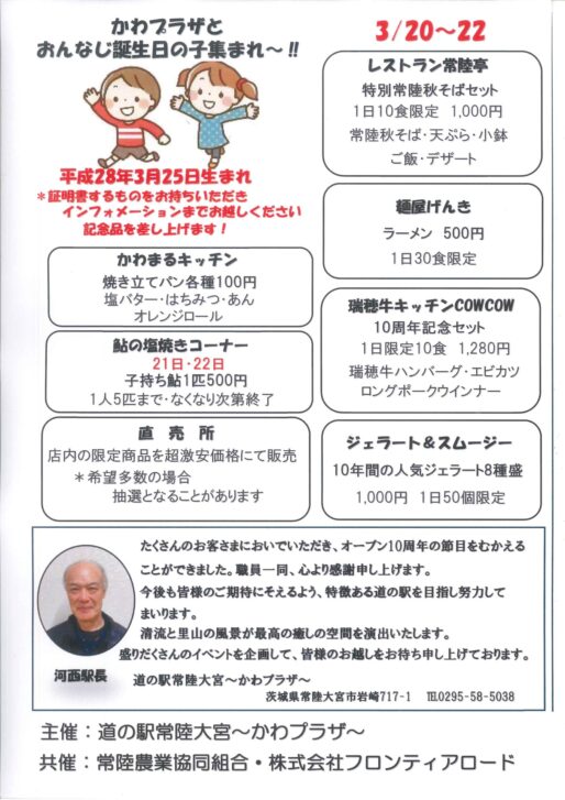 オープン10周年イベント開催 2026.03.08 お陰様で2026年3月25日に、道の駅常陸大宮~かわプラザ~は10周年を迎えます。 感謝の意味を込めまして、3月20日(金)21日(土)22日(日)に感謝祭を開催致します。 ご家族皆様でお越し下さい。